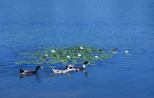 睡莲也不甘示弱,酣畅的绽放,金黄色的花蕊在微风中轻轻颤动,宛如一盏盏精致的橘灯,点亮了这片水域。